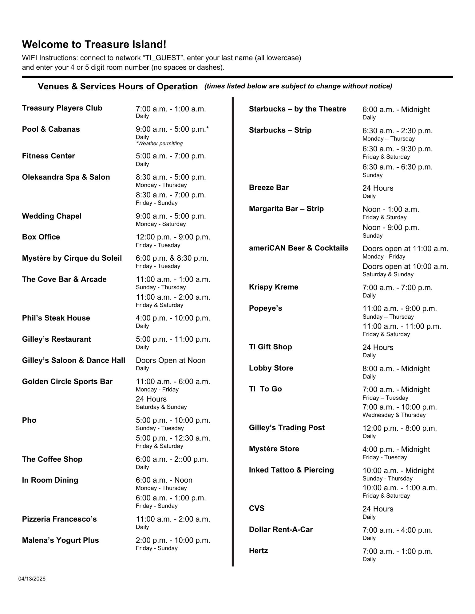 Please call Guest Services direct at 1-702-894-7409, or email guestservices@treasureisland.com for additional details.